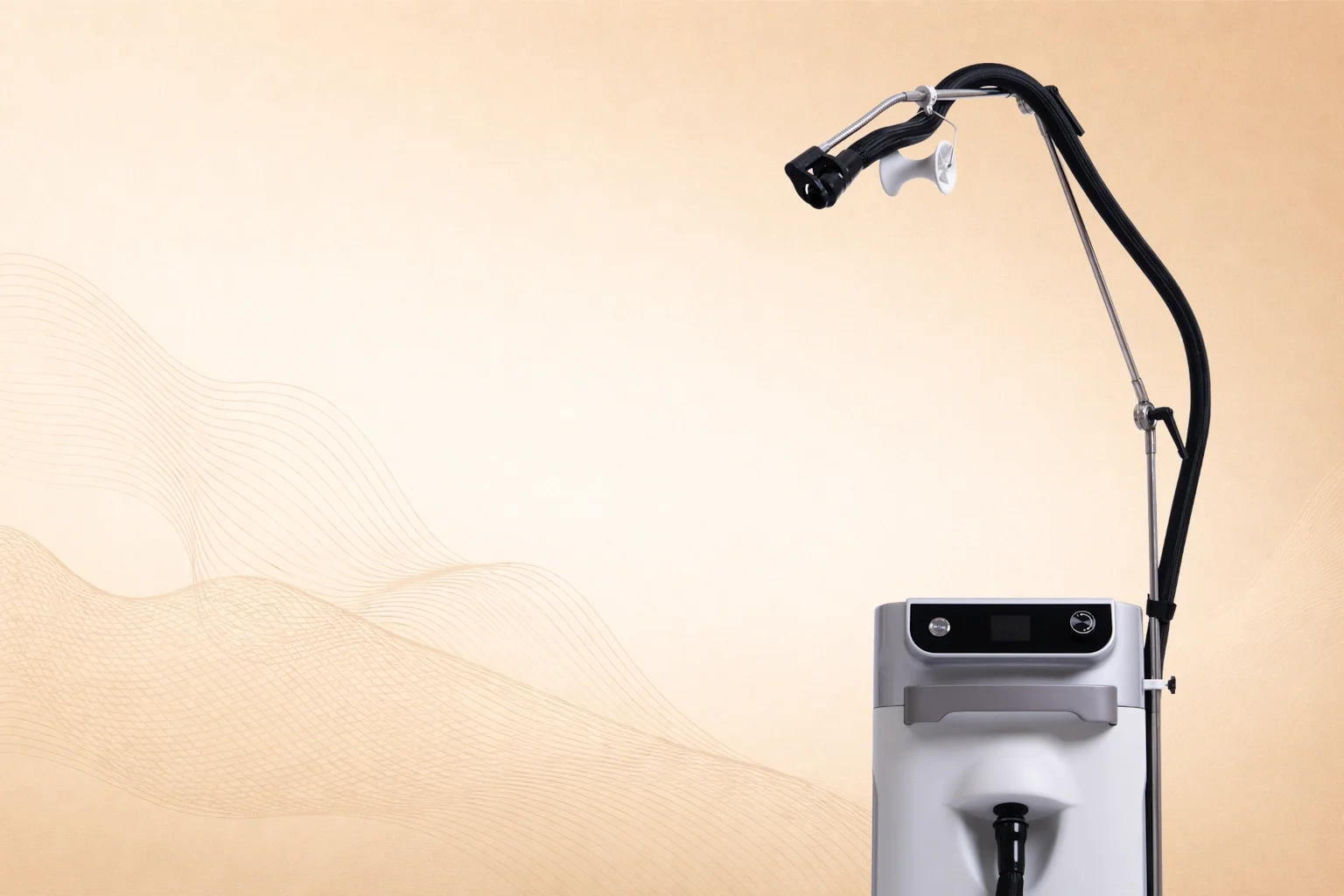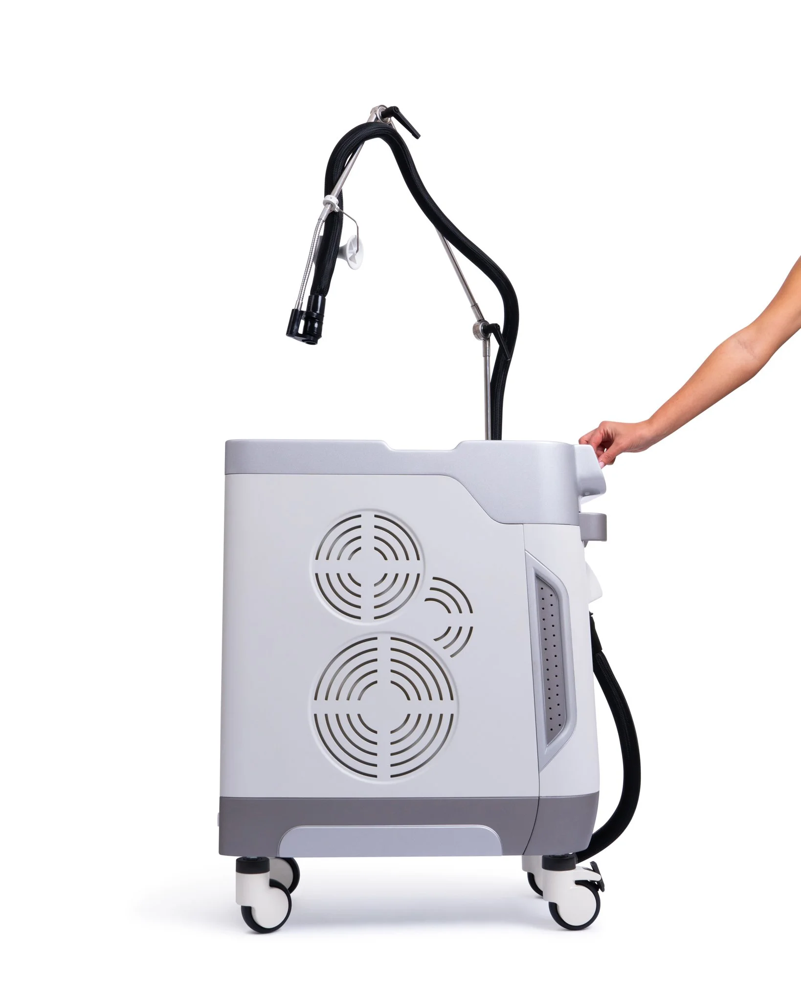 The SKYN Z includes an adjustable support bar system that holds the cooling hose in place, allowing hands-free operation during long procedures.